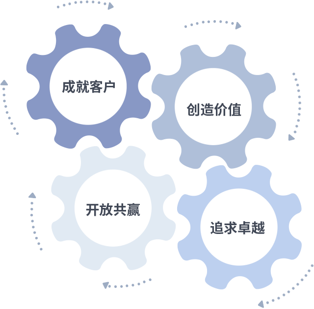 成就客户是一切决策的出发点,,创造价值是衡量所有工作的标准,,追求卓越是我们做事做人的态度,,开放共赢是我们的格局也是最终的结果。。。价值观的齿轮环环相扣,,,推动着组织里的每个人不断向前。。。。